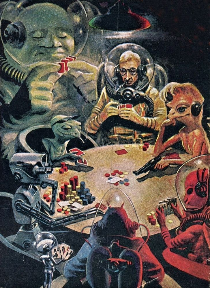 Wally Wood’s April 1959 cover to Galaxy magazine. Note the space suit helmet with apparatus for smoking cigarettes.