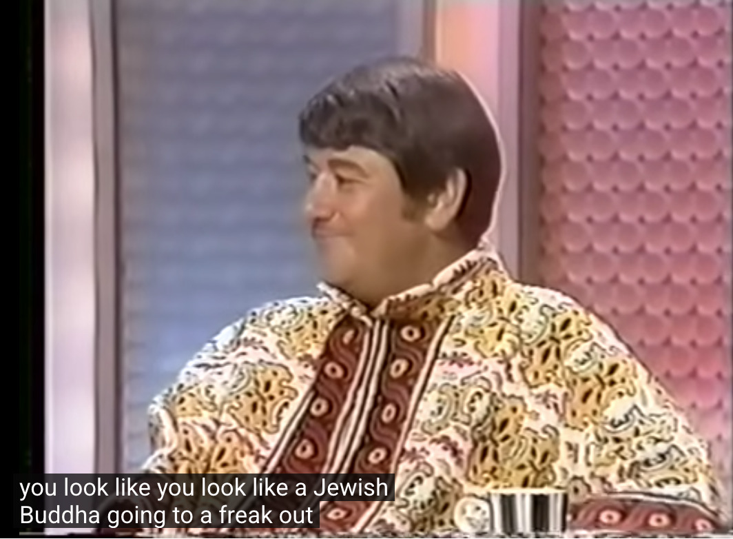 April 15, 2026 Mitch Wagner Buddy Hackett dressed like a Jewish Buddha Going to a Freak Out www.tumblr.com/oldshowbi…